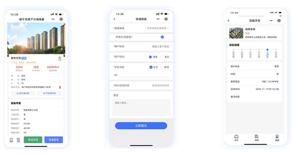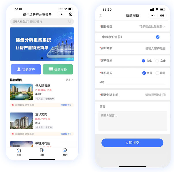 方式1.首页点击快速报备按钮,选择项目(可选单个/多个项目)填写报备客户的信息,姓名 电话(支持全号/隐号)预约时间等提交即可